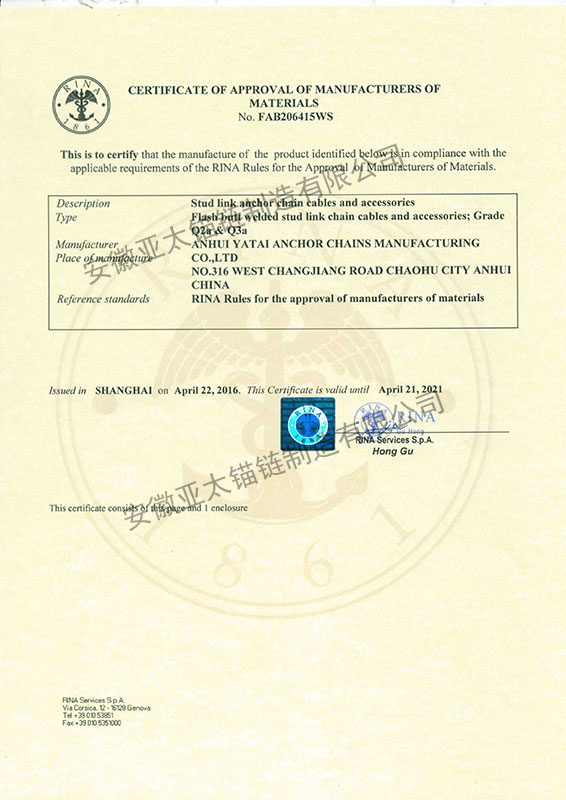 安徽亞太錨鏈制造有限公司是國家高新技術(shù)企業(yè),也是國家GB/T 549-2017《電焊錨鏈》標準的起草和制定單位之一。公司旗下設(shè)有錨鏈分廠、浮標分廠、舾裝件分廠等多個分廠。公司專業(yè)從事φ12.5mm-φ107mm二、三級船用錨鏈、浮標錨鏈、錨鏈附件,錨、船舶曬裝產(chǎn)品、航標、系船浮、船型標、多種規(guī)格海洋監(jiān)測浮標及航標燈等產(chǎn)品的生產(chǎn)、安裝和服務(wù)。目前公司的產(chǎn)品銷往全國各地船廠、碼頭、航標處、航道局、海洋局,并已走上國際市場,如東南亞、中東、歐美等國家。